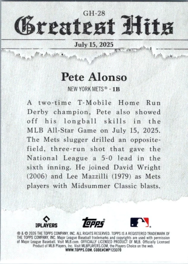 This is a nice example of a 2026 Topps #GH-28 Pete Alonso 2025 Greatest Hits