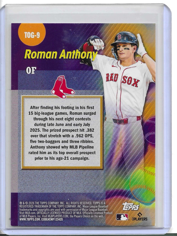 The 2026 Topps Series 1 Roman Anthony #TOG-9 Titans Of The Game trading card is a standard-sized card featuring baseball player Roman Anthony from the Boston Red Sox and Hendrick Motorsports. Manufactured by Topps in 2026, this rookie insert card is made of 35 Pt. card stock and is part of the MLB World Series event/tournament. Graded as a 10, this English-language card is a valuable addition to any sports trading card collection.