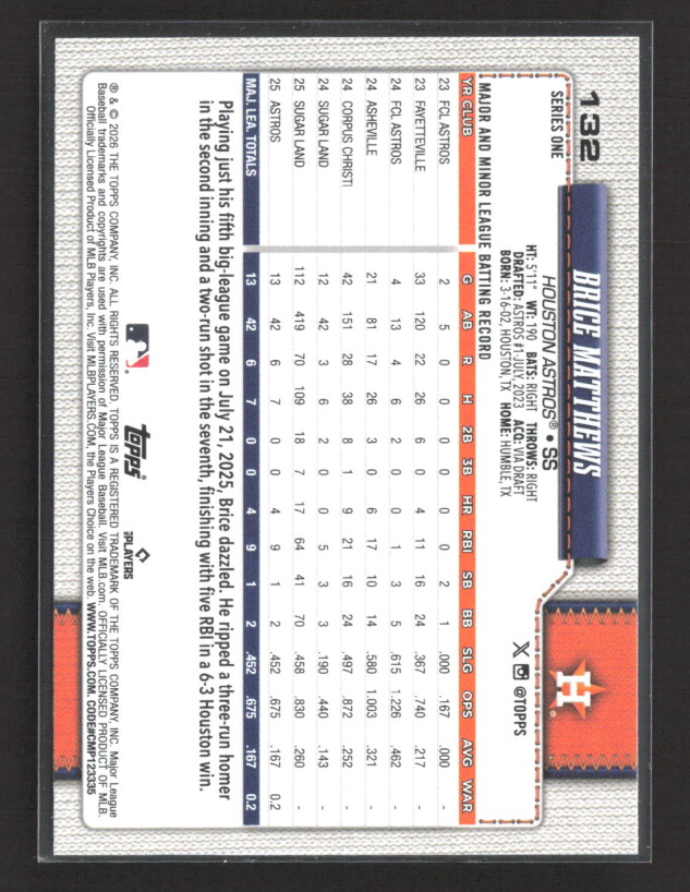 You are purchasing a 2026 Topps Series One Brice Matthews #132 RC. You will receive the exact item in the photographs. Thank you for looking.