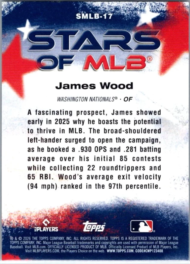 This is a nice example of a 2026 Topps #SMLB-17 James Wood Stars of MLB