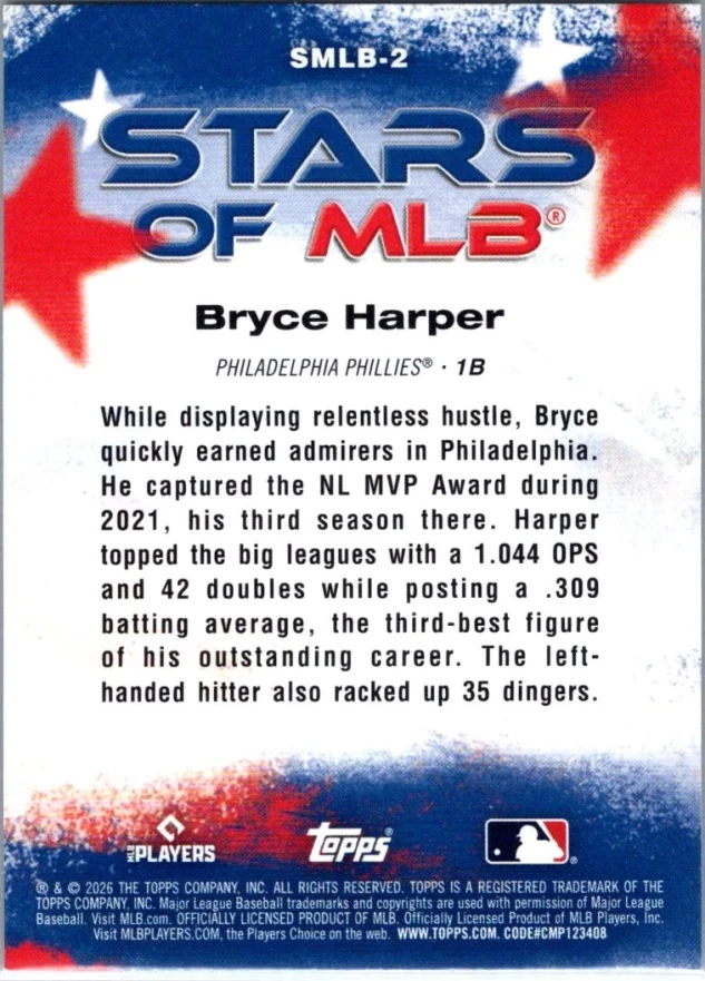 This is a nice example of a 2026 Topps #SMLB-2 Bryce Harper Stars of MLB