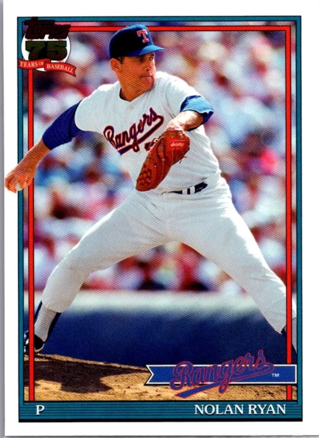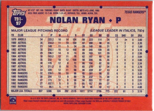 This is a nice example of a 2026 Topps #T91-97 Nolan Ryan 1991 Topps Baseball 35th Anniversary (Series One)