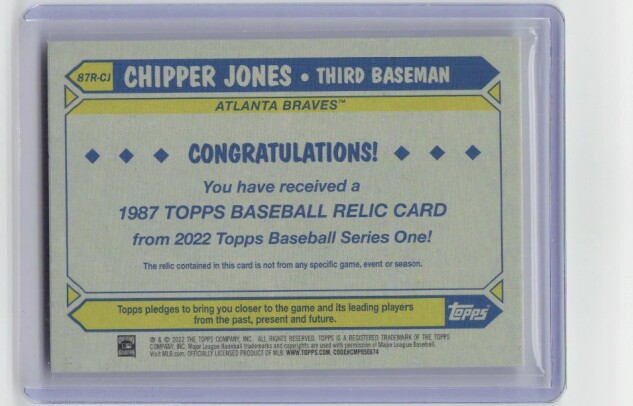 22 Topps #87R-CJ Chipper Jones 1987 Topps Bases 35th Anniversary Relics