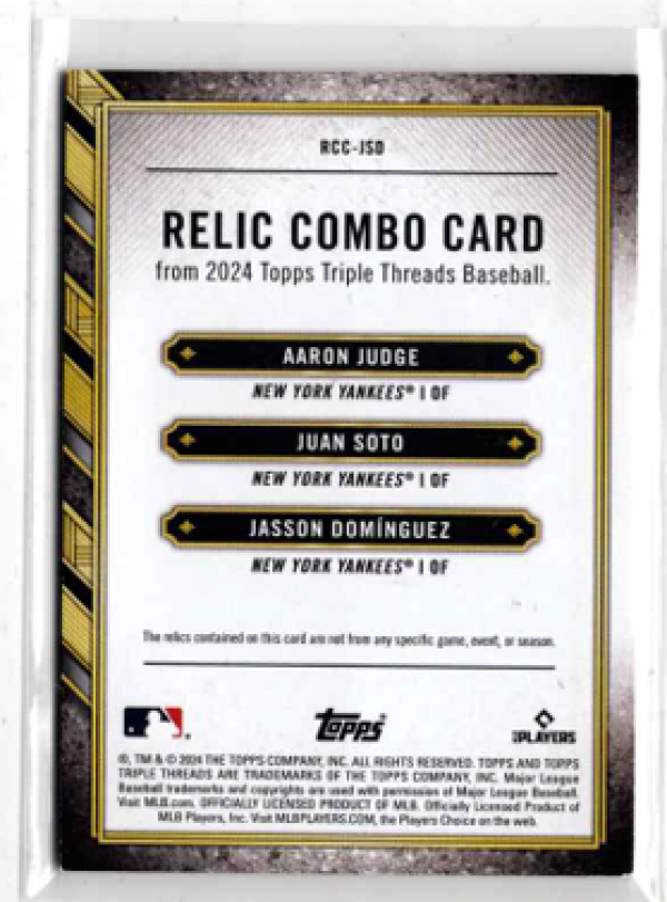 Aaron Judge, Juan Soto, Jasson Dominguez 2024 Topps Triple Thread Game Used Mem /27 (First on print)