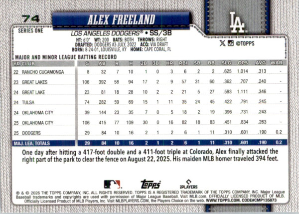 Alex Freeland 2026 Topps #74 Polka Dot Los Angeles Dodgers