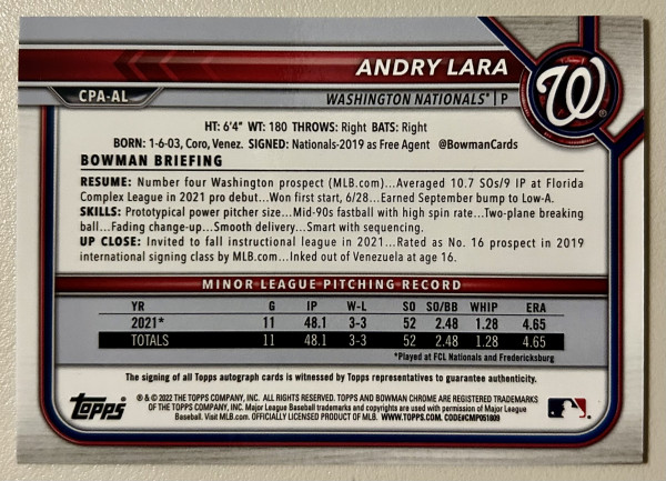 Andry Lara 2022 Bowman 1st Bowman Chrome Auto CPA-AL Washington Nationals