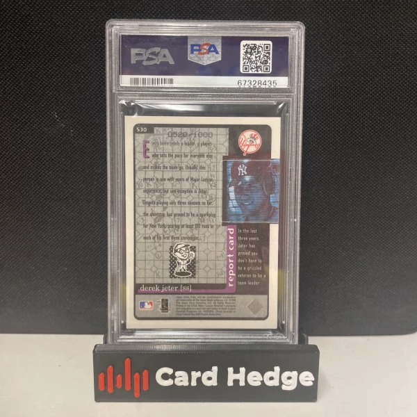 This is a 1999 Upper Deck Retro Derek Jeter baseball trading card from the Major League (MLB). The card features a "Old School / New School" design, with a silver parallel version numbered out of 1000. It is an original licensed reprint made of card stock, with serial numbering and is an insert in the set. The card showcases Derek Jeter of the New York Yankees and is graded PSA 10.