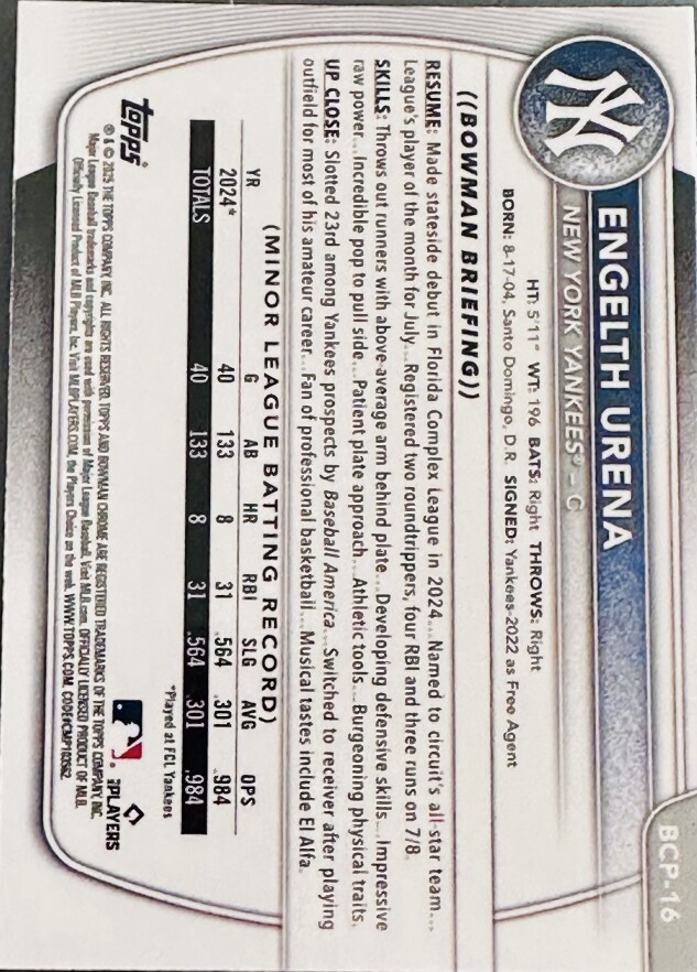 2024 Bowman Chrome Engelth Urena 1st Bowman Mojo Refractor – New York Yankees