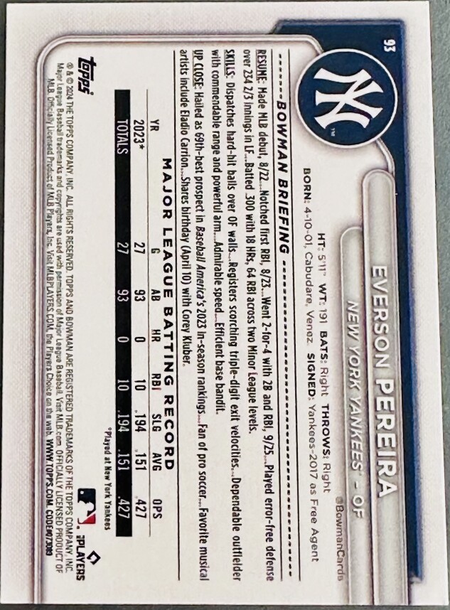 Everson Pereira 2024 Bowman Chrome Rookie Card Yankees #93