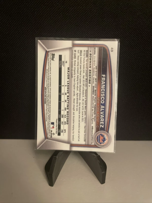 This trading card features Francisco Alvarez of the New York Mets in the 2023 Bowman Chrome Mega Box #49 Rookie Card. It is an original card stock and is a part of the Major League (MLB) set. The card is an excellent addition to any baseball fan's collection, and its parallel/variety is the Mega Box Mojo Refractor.