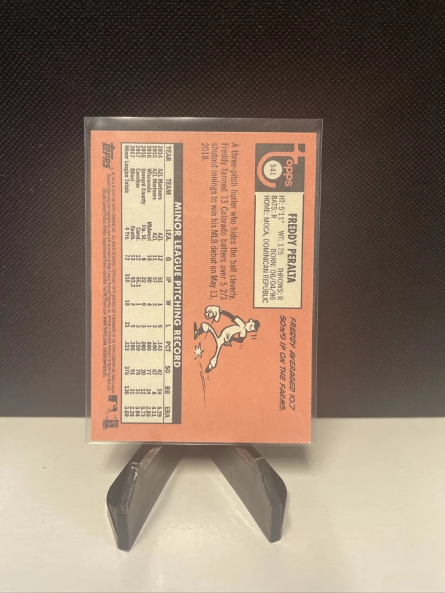 This is a 2018 Topps Heritage #541 RC trading card of Milwaukee Brewers player Freddy Peralta. It features a standard size card made of card stock material, with an original print and licensed by Topps. The card is not autographed and is not a vintage reprint. It is part of the 2018 set of Topps Heritage baseball cards, with the rookie feature and parallel variety of "Base". The card was manufactured in the United States and is a great addition to any baseball enthusiast's collection.