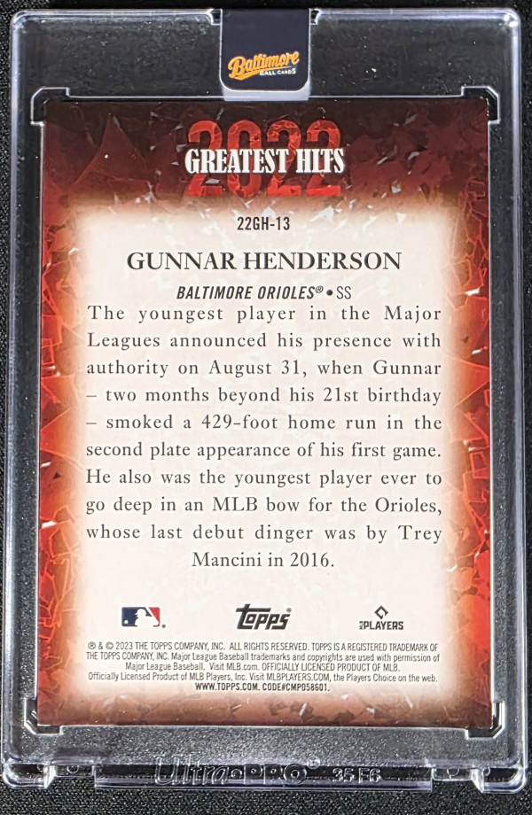 GUNNAR HENDERSON 2023 TOPPS #22GH13 2022 GREATEST HITS BLACK /299 ROOKIE