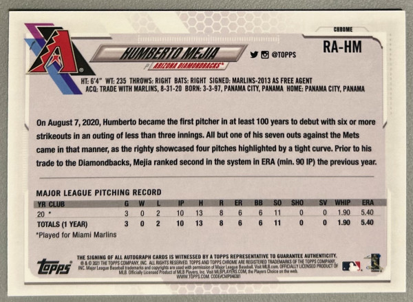 Humberto Mejia 2021 Topps Chrome Rookie RC AUTO #RA-HM Diamondbacks