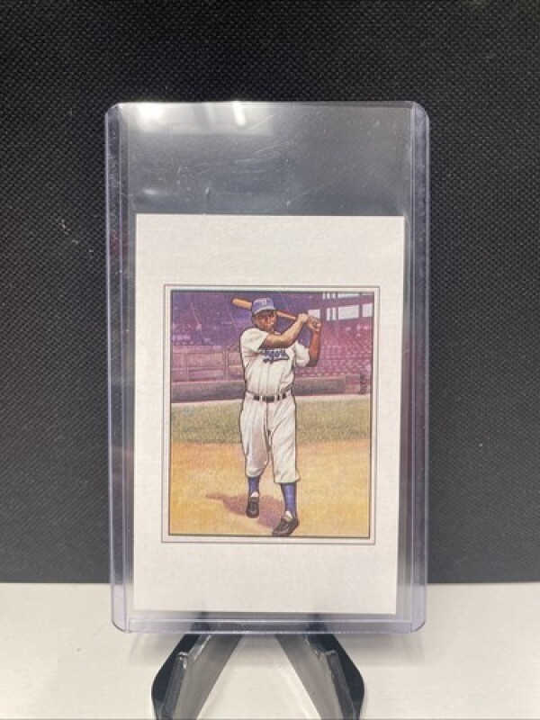 This is a Jackie Robinson 1989 Bowman Inserts 1950 Reprint trading card featuring a standard card size made of card stock. It is a licensed reprint of a 1950 card, part of the Major League (MLB) set by Bowman. The card showcases Robinson, a player for the Brooklyn Dodgers, and is numbered NNO. It is a sports trading card with an insert feature, perfect for collectors of baseball memorabilia.