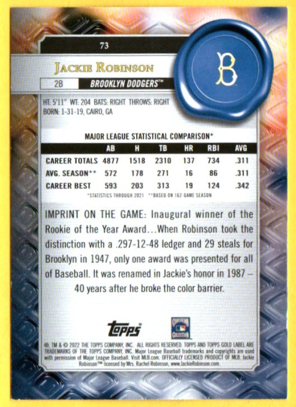 Quick, clean Jackie Robinson card from the Gold Label set, featuring the legendary Hall of Famer and baseball icon.