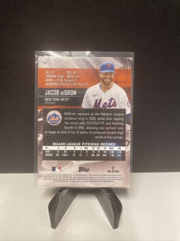 For baseball card collectors, this 2021 Topps Stadium Club card featuring New York Mets pitcher Jacob deGrom is a must-have addition to your collection. The card is made of high-quality card stock and features a stunning red foil parallel variety. It is an original release by Topps and has not been reprinted or licensed. The card number is 167 and it belongs to the Standard size set.