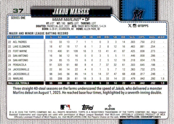 Jakob Marsee 2026 Topps #37 Green Foil Miami Marlins