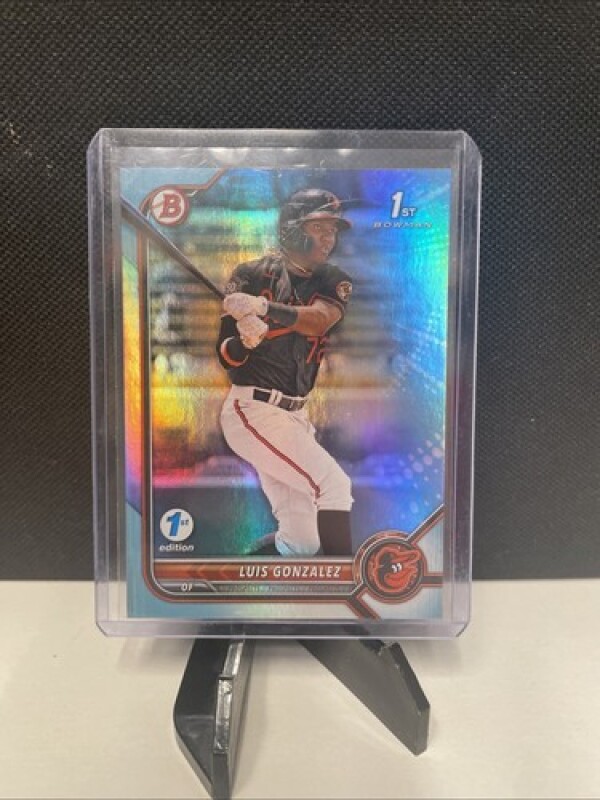 This is a Luis Gonzalez 2022 Bowman 1st Edition Sky Blue Paper trading card, featuring a parallel/variety design. The card is part of the Major League Baseball (MLB) set and has the card number #BPPF-125. It is a standard-sized original card manufactured in 2022 in the United States by Bowman. The card is not autographed and is not graded. It is dedicated to the Baltimore Orioles team.