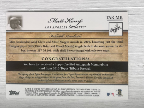 Matt Kemp 2010 Topps Certified Auto Relic 29/99 TARMK