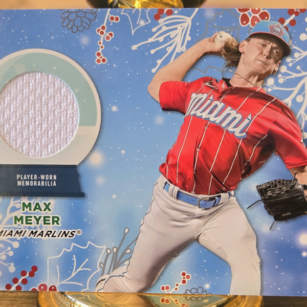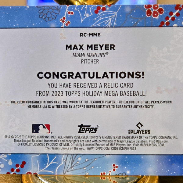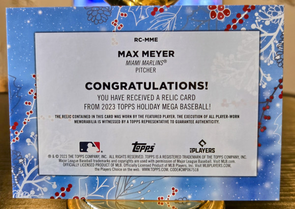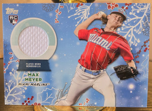 The Max Meyer 2023 Topps Holiday Relics #RC-MME Rookie Patch is a highly collectible sports trading card featuring the up-and-coming baseball star from the Miami Marlins. This card is part of the 2023 Topps Holiday set and includes a memorabilia patch, making it a valuable piece for any MLB fans or collectors. With a near mint or better condition, this card is sure to be a prized addition to any sports memorabilia collection.