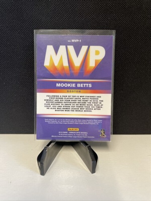 This sports trading card features Mookie Betts, a Major League Baseball player for the Boston Red Sox and Los Angeles Dodgers. The card is made of high-quality card stock and is an original 2019 Donruss Optic set by Panini. It has a base parallel variety and is an insert card with the card number MVP-1.