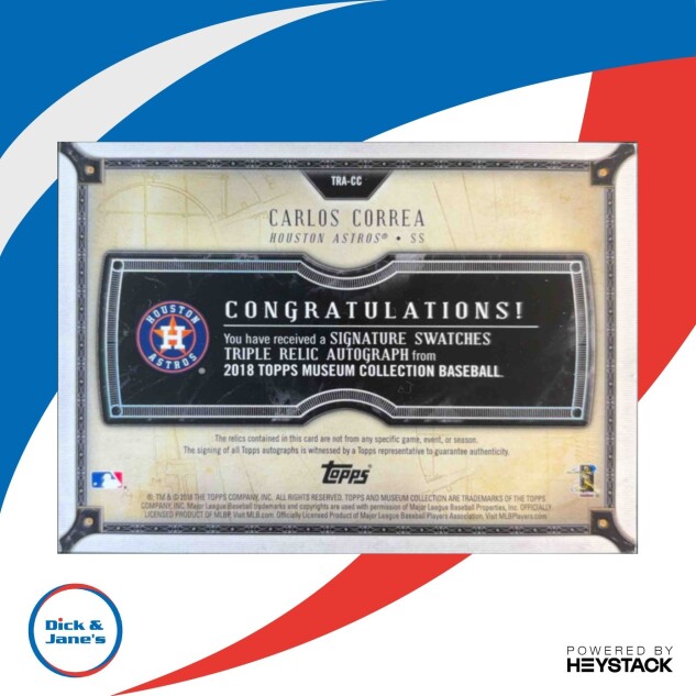 You are purchasing a Museum Collection Carlos Correa #TRA-CC Signature Swatches Triple Relic Autographs. You will receive the exact item in the photographs. Thank you for looking.