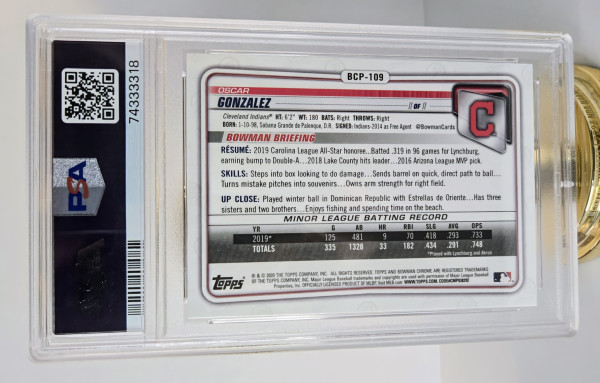 The product is a PSA 10 rated 2020 Bowman Chrome 1st Bowman Prospects trading card featuring baseball player Oscar Gonzalez of the Cleveland Guardians. The card is from the Chrome Prospects insert set by Topps, marking Gonzalez's rookie season in Major League Baseball. The card is a valuable collectible for fans and collectors of baseball trading cards.