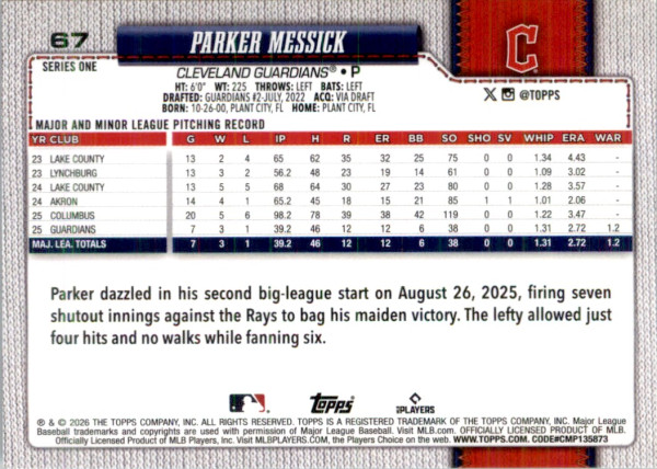 Parker Messick 2026 Topps #67 Green Foil Cleveland Guardians