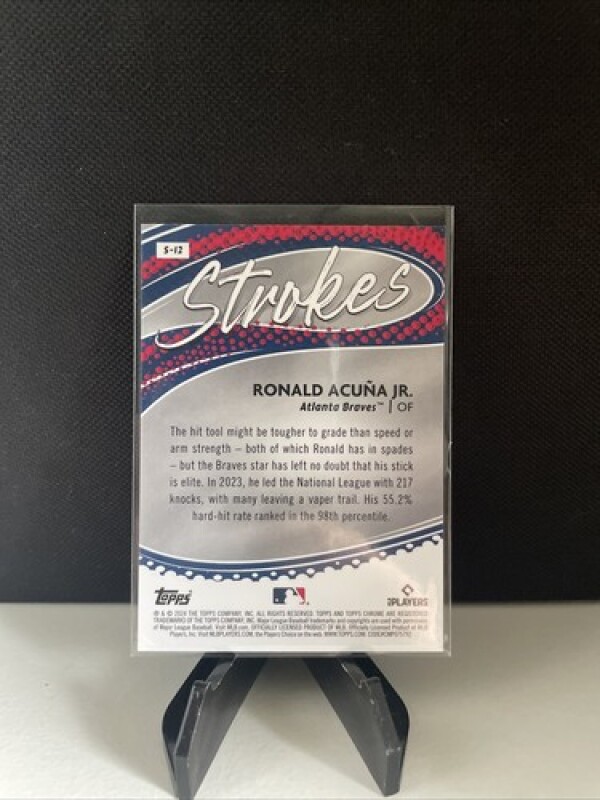 This 2024 Topps Chrome Strokes trading card features Major League Baseball player Ronald Acuna Jr. of the Atlanta Braves. The card is made of high-quality card stock and is an original, licensed reprint. It is part of the 2024 Topps Chrome set and has a card number of S-12.