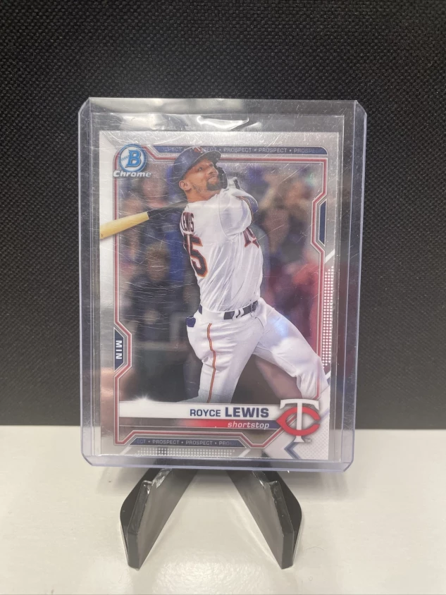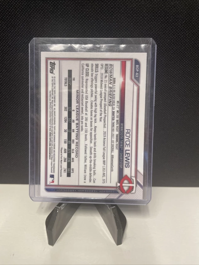 This Royce Lewis trading card is a must-have for any baseball fan! Featuring the player's name, team, and card number, this 2021 Bowman Chrome Prospects #BCP-63 card is an original, made of card stock material, and is a Chrome parallel/variety. Perfect for collectors, this card is from the base set and manufactured by Topps in the United States. It is a standard size and depicts the player in action.
