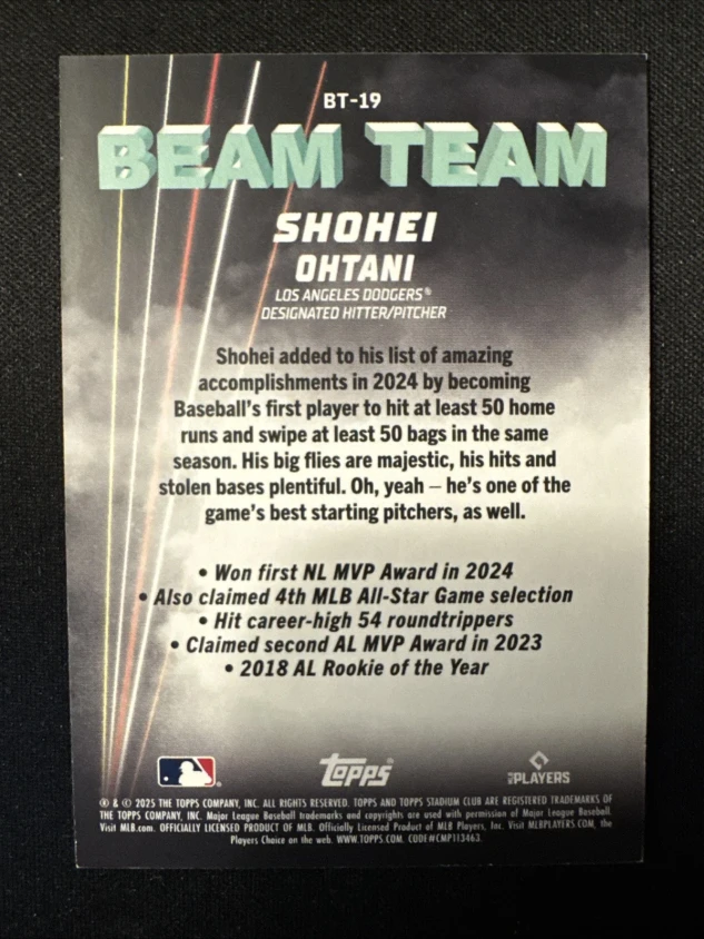 The product is a rare and highly sought-after 2025 Topps Stadium Club Beam Team trading card featuring Shohei Ohtani of the Los Angeles Dodgers. This specific card, designated as BT-19, is a Case Hit SSP (super short print) variation, making it a valuable addition to any baseball card collection. Produced by Topps in the United States, this card is part of the Beam Team insert set and is a must-have for fans and collectors of MLB memorabilia.