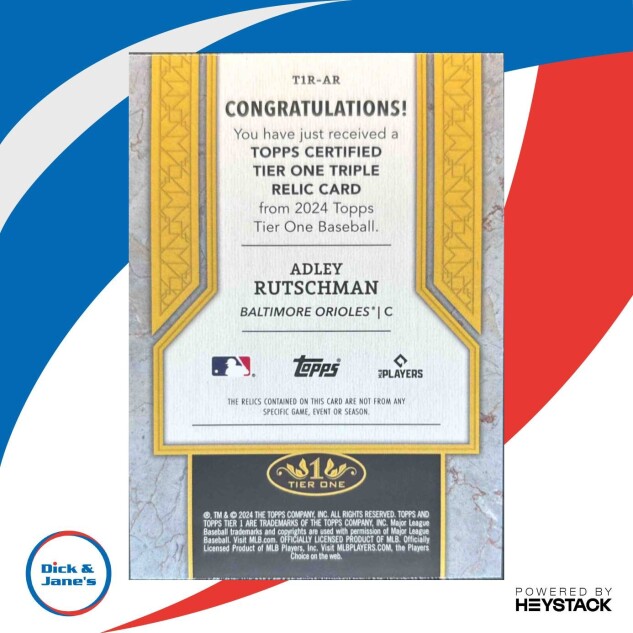 You are purchasing a Tier One Adley Rutschman #T1R-AR Tier One Relics Triples. You will receive the exact item in the photographs. Thank you for looking.