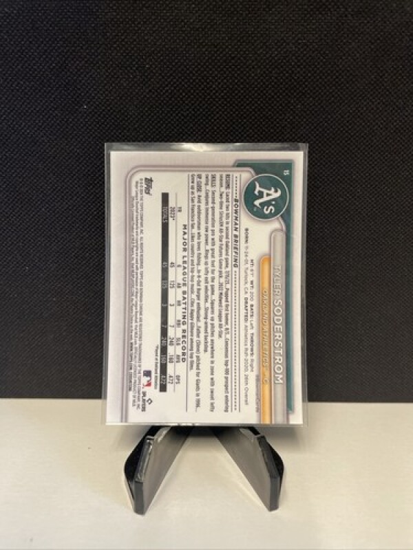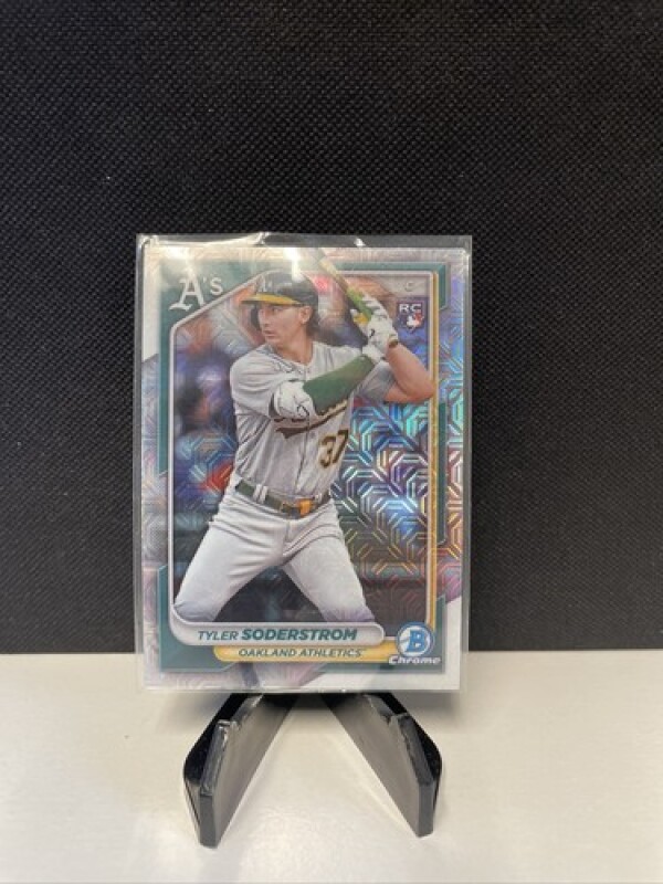 This is an original 2024 Bowman Mega Box Mojo Refractor trading card featuring Tyler Soderstrom of the Oakland Athletics. The card is made of high-quality card stock and is a standard size for easy storage or display. It is a rookie card and has a card number of 15 in the set.