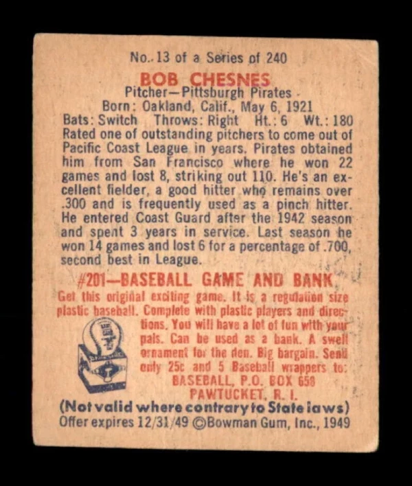 Vintage 1949 Bowman #13 Bob Chesnes RC VG/VGEX