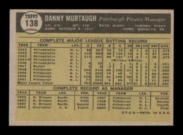Vintage 1961 Topps #138 Danny Murtaugh MG EXMT