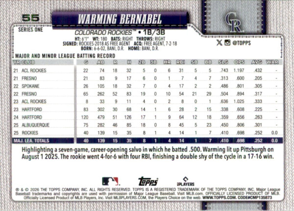Warming Bernabel 2026 Topps #55 Polka Dot Colorado Rockies