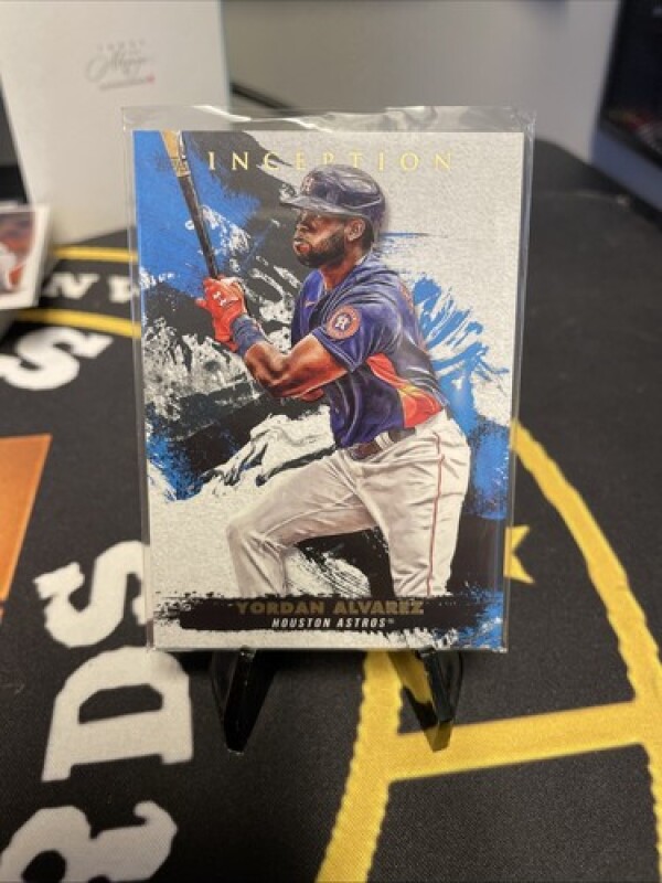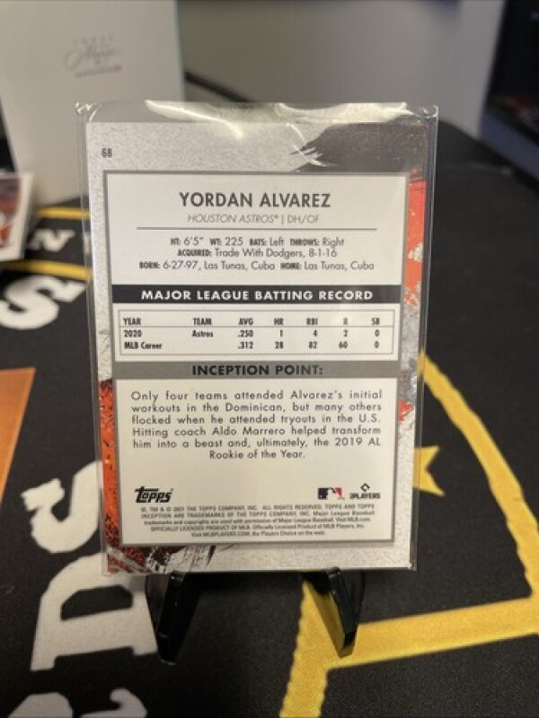 This is a 2021 Topps Inception sports trading card featuring Yordan Alvarez of the Houston Astros, card number 68. It is a standard-sized card made of card stock, an original licensed reprint by Topps for Major League Baseball (MLB). The card is not autographed and is part of the base set, a parallel/variety in the 2021 season. It is a baseball trading card manufactured in the United States.