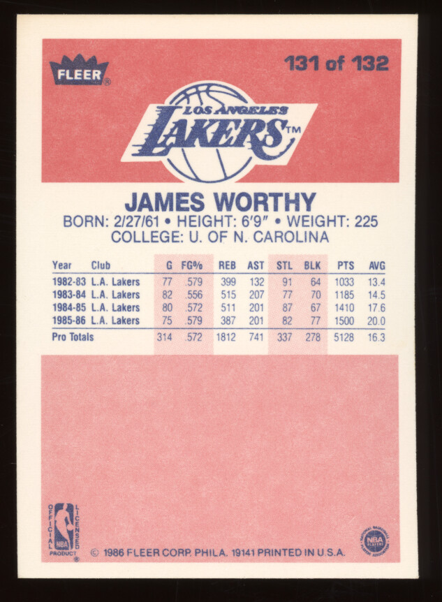 You are purchasing a 1986 Fleer Basketball James Worthy #131. You will receive the exact item in the photographs. Thank you for looking.