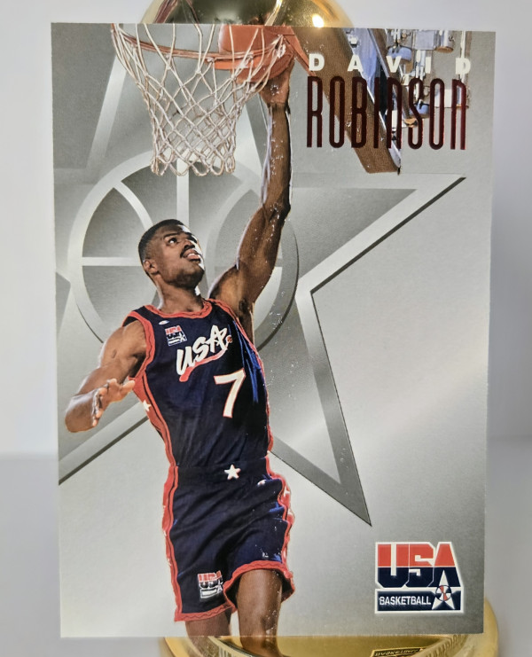 The product is a 1996 Skybox Texaco USA Basketball trading card featuring David Robinson of the United States Olympic basketball team. Manufactured by Fleer/SkyBox International, this sports trading card is part of the base set for the 1996 season. The card number is 10 and it is a part of the FIBA league. With its iconic design and historical significance as part of the "Dream Team," this card would be a valuable addition to any basketball card collection.