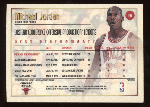 You are purchasing a 1997 Bowman's Best Basketball Michael Jordan #96 Best Performance. You will receive the exact item in the photographs. Thank you for looking.