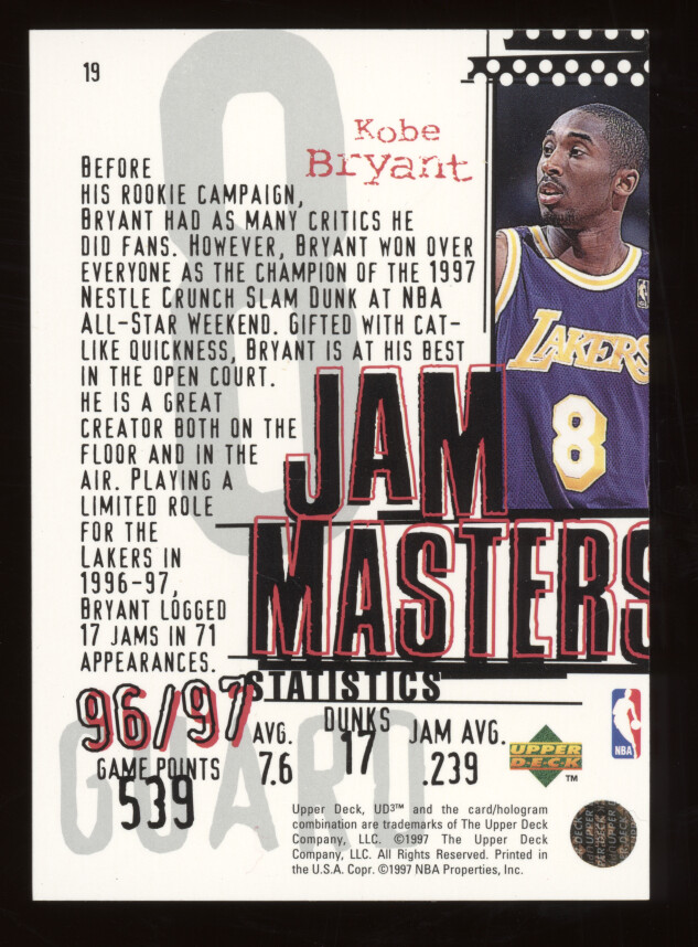 You are purchasing a 1997 Upper Deck UD3 Jam Masters Kobe Bryant #19. You will receive the exact item in the photographs. Thank you for looking.