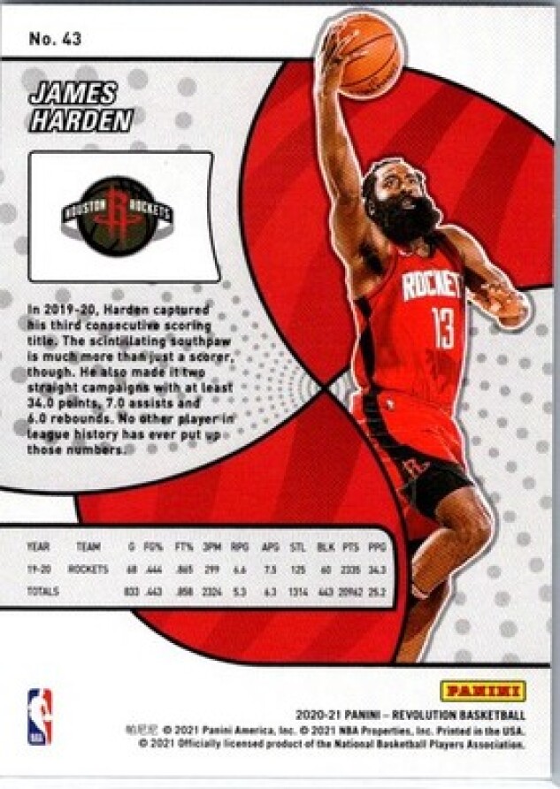 This is a nice example of a 2020-21 Panini Revolution #43 James Harden