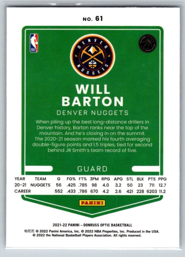 You are purchasing a 2021-22 Donruss Optic Will Barton #61. You will receive the exact item in the photographs. Thank you for looking.