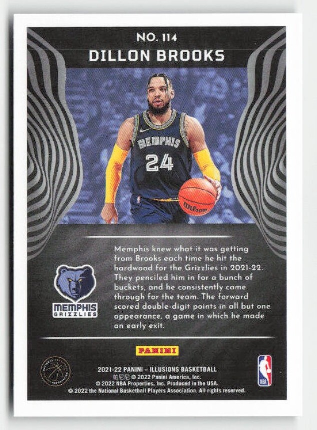 You are purchasing a 2021-22 Panini Illusions Dillon Brooks #114. You will receive the exact item in the photographs. Thank you for looking.