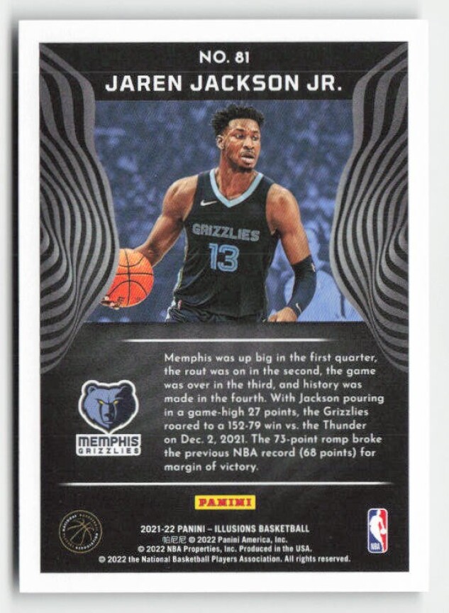 You are purchasing a 2021-22 Panini Illusions Jaren Jackson Jr. #81. You will receive the exact item in the photographs. Thank you for looking.