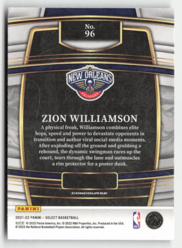 You are purchasing a 2021-22 Panini Select Zion Williamson #96. You will receive the exact item in the photographs. Thank you for looking.