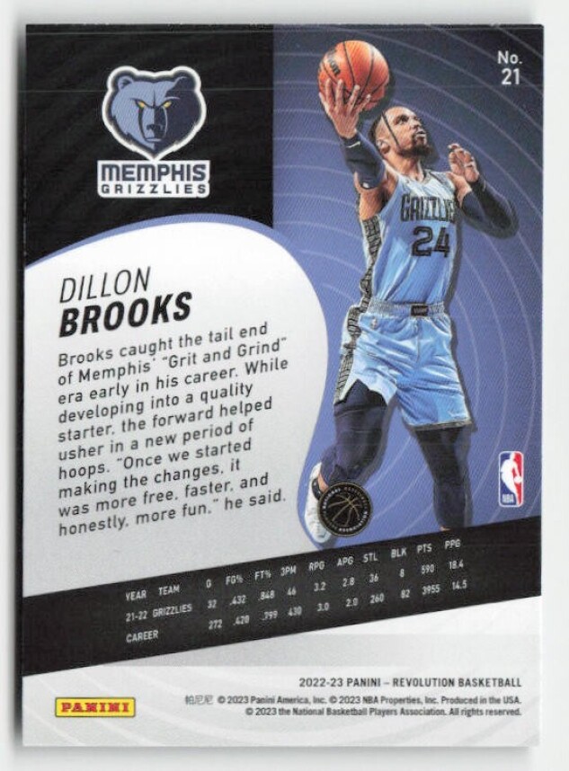 You are purchasing a 2022-23 Panini Revolution Dillon Brooks #21. You will receive the exact item in the photographs. Thank you for looking.
