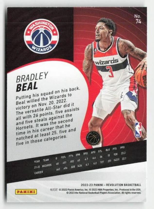 You are purchasing a 2022-23 Panini Revolution Bradley Beal #74. You will receive the exact item in the photographs. Thank you for looking.