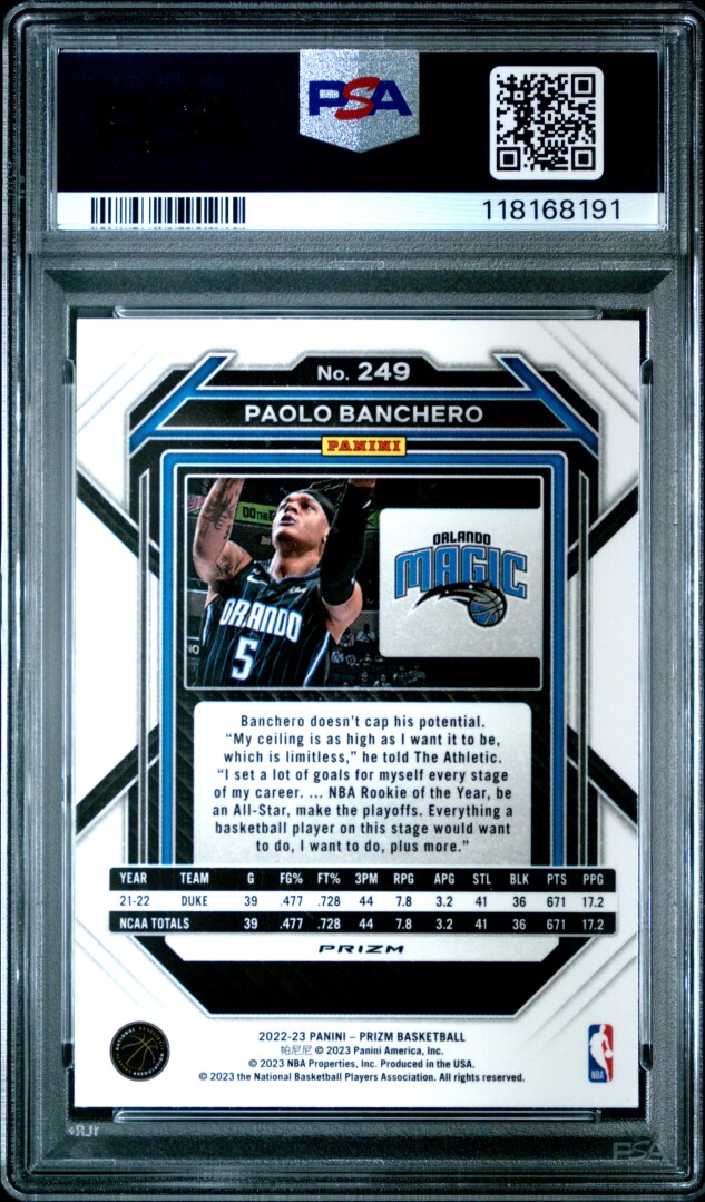 You are purchasing a 2022 Panini Prizm Basketball Paolo Banchero #249 Red Ice RC PSA 10. You will receive the exact item in the photographs. Thank you for looking.