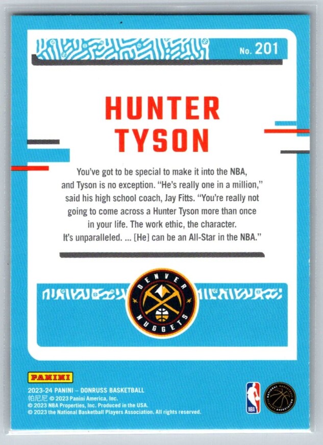You are purchasing a 2023-24 Donruss Hunter Tyson #201 RC. You will receive the exact item in the photographs. Thank you for looking.